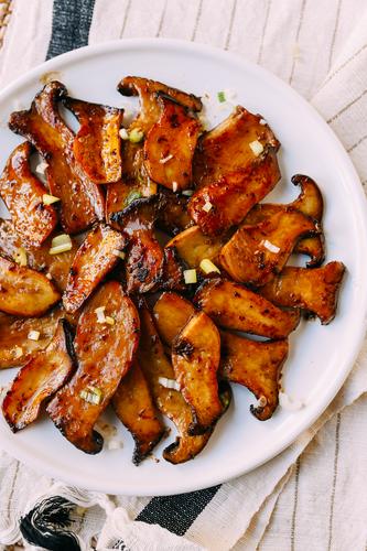 Explore the full-bodied flavors of king oyster mushrooms with this enticing dish. Coated with a luscious, savory-sweet soy butter glaze and garnished with scallions, these mushrooms make an excellent side dish and have the potential to steal the show.