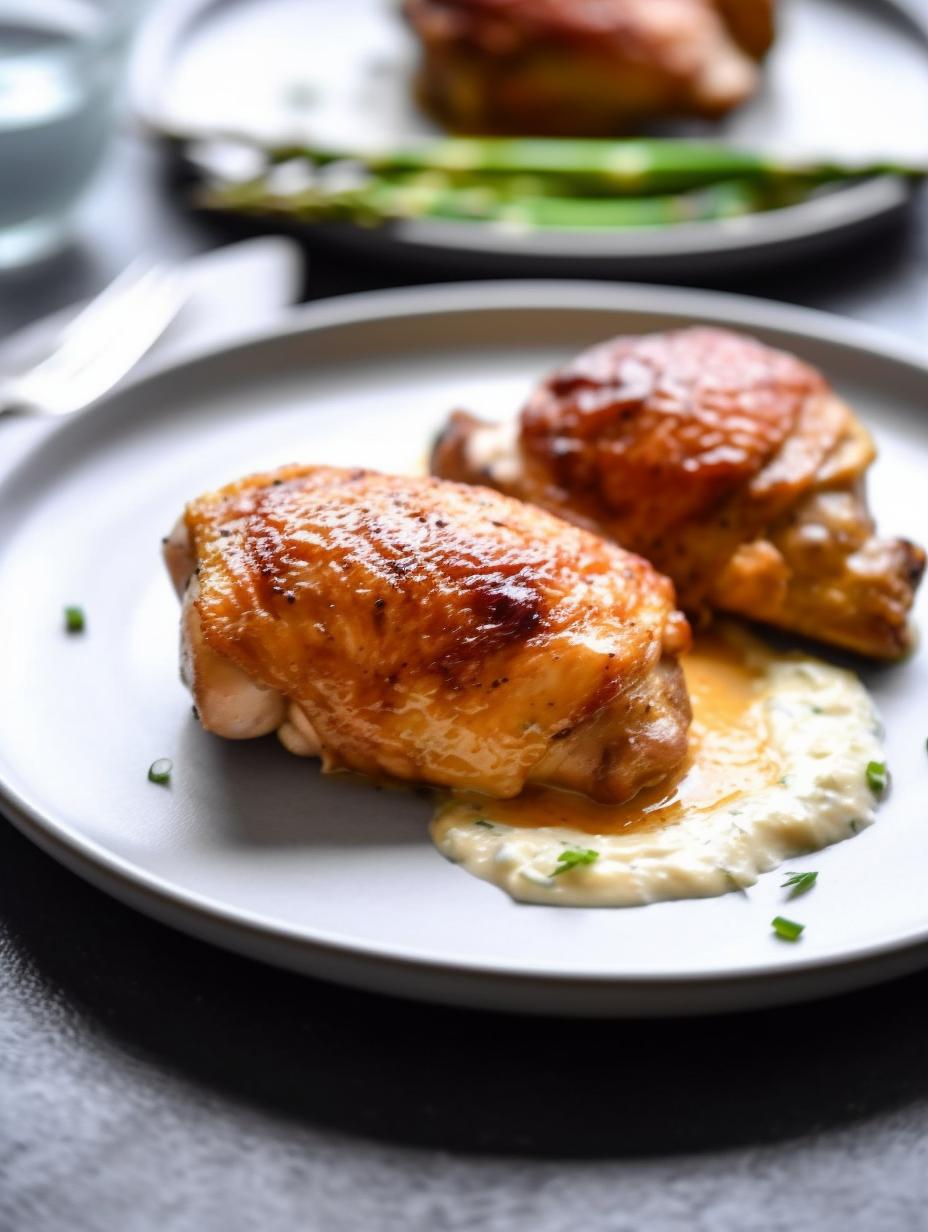 Spoon the butter sauce over the chicken thighs, garnish with chopped fresh parsley, and serve immediately.
