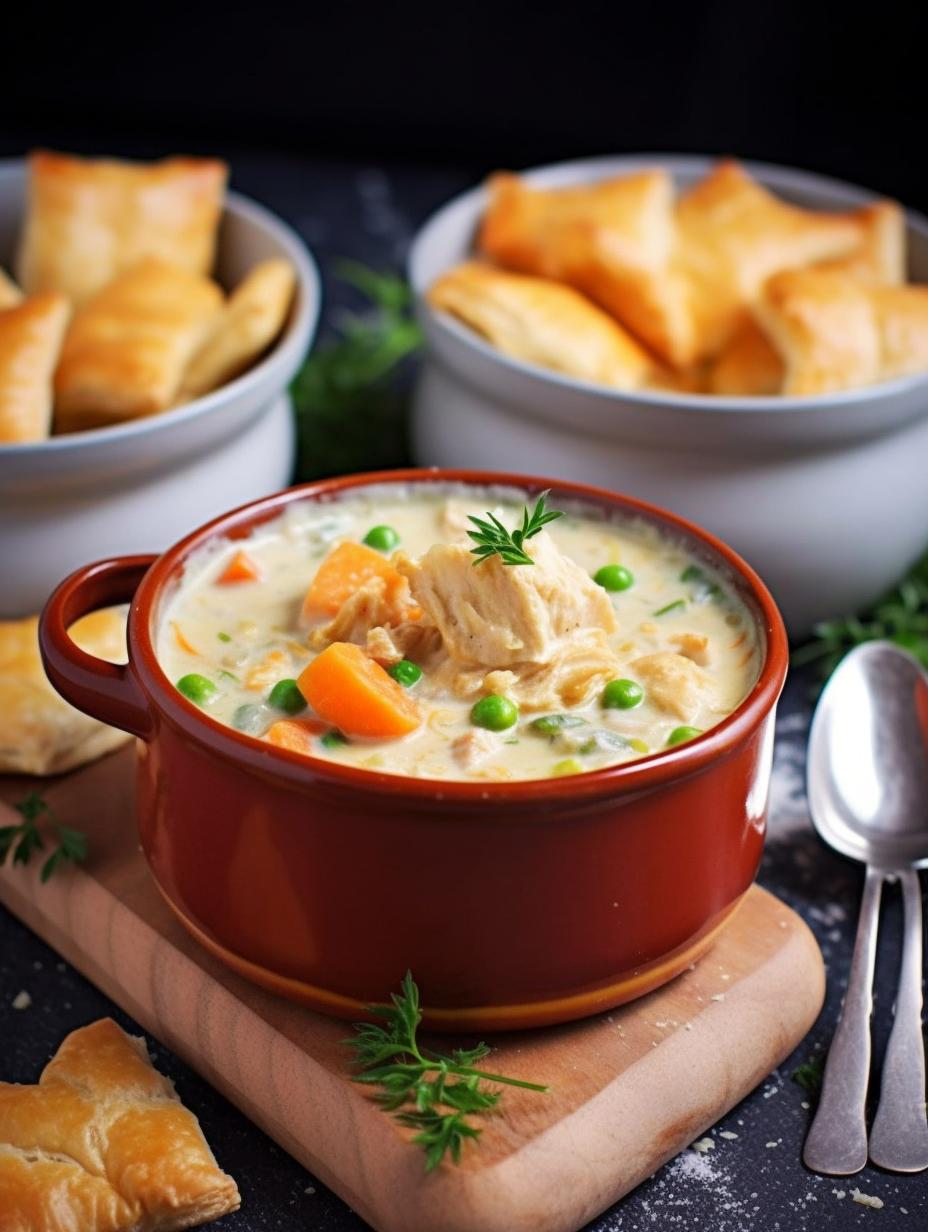 Indulge in this warm and creamy chicken pot pie soup that's perfect for a comforting lunch or dinner. This homemade soup is garnished with crispy puff pastry bites, making every spoonful a delightful experience.