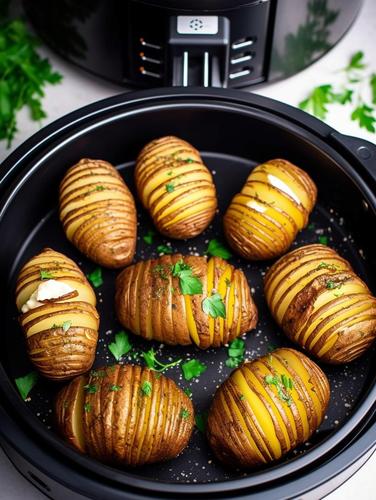 Wash and dry the potatoes. Using a sharp knife, cut slits in the potatoes, about 1/8 inch apart, stopping just before you cut through so that the slices stay connected at the bottom.