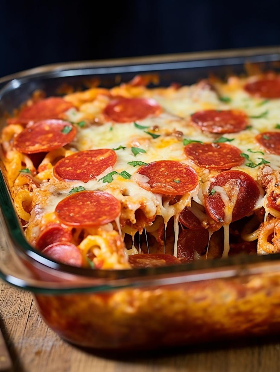 This comforting casserole pairs the satisfaction of a hearty pasta meal with the familiar, crowd-pleasing flavors of a delicious pizza. Spiral rotini noodles are delicately enrobed in a rich marinara sauce, tossed with flavorful ground beef and zesty pepperoni, then baked to perfection under a gener...