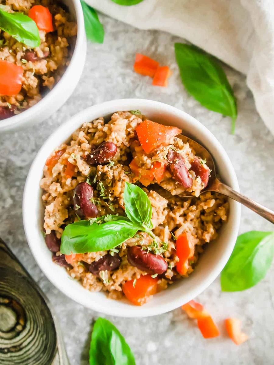 A healthy and naturally Gluten-free dish, made in one pot, with ground turkey, rice and beans and spiced with bell peppers and cumin.