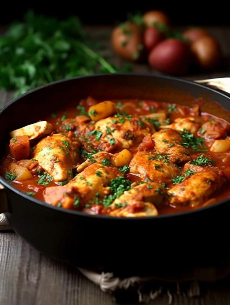 This easy-to-follow one-pot savory tomato chicken with potatoes recipe is perfect for busy weeknights. It combines tender chicken, potatoes, and an aromatic mix of spices to create a satisfying and flavorful meal. Serving 4, it has approximately 300 calories per serving.