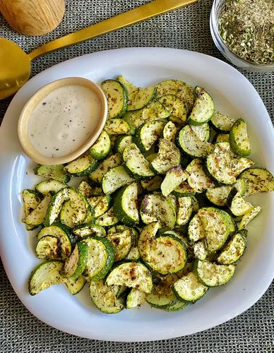 Parmesan Zucchini Chips are made even more flavorful with harissa powder! This zucchini gets roasted in the oven with parmesan cheese to make a cheesy parmesan crust. The harissa spice adds a little kick!