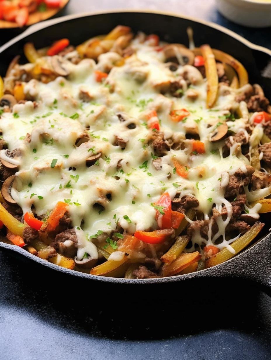 This Philly Cheesesteak Skillet Bake is an easy and delicious dinner that combines tender steak, sautéed vegetables, and melted cheese in one skillet. Perfect for busy weeknights and keto-friendly!