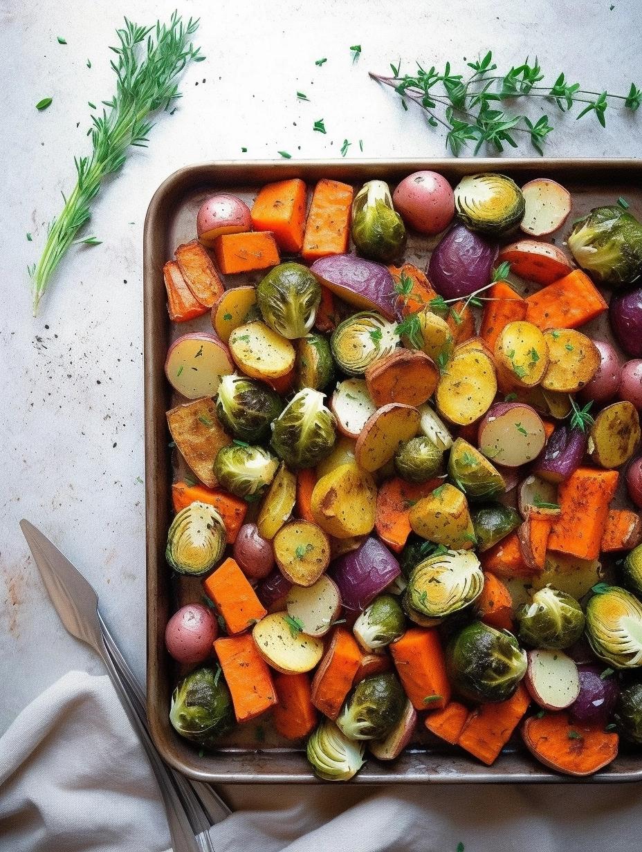A mouthwatering medley of roasted vegetables seasoned with a perfectly balanced blend of herbs, perfect as a side dish or a hearty main course.