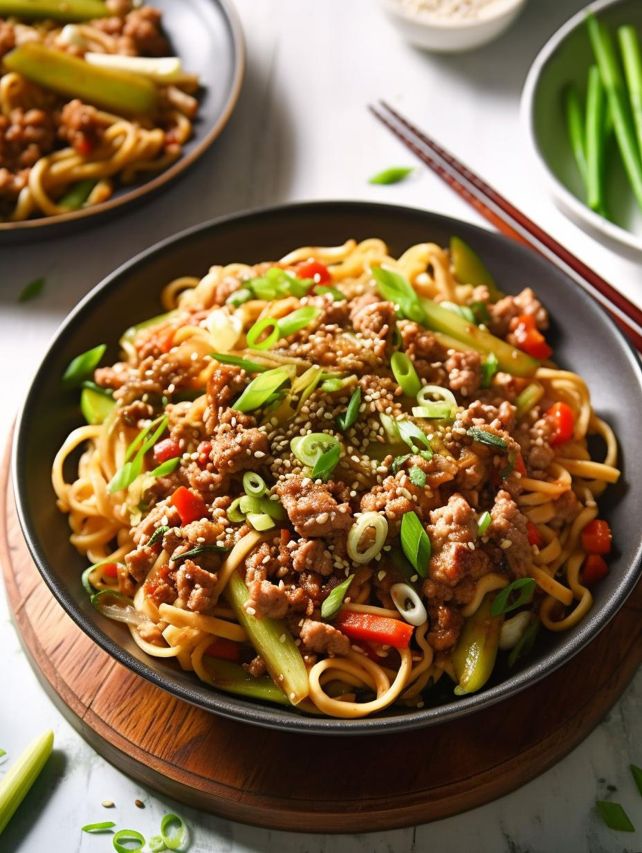 Whip up a mouthwatering and easy-to-follow Savory Pork & Veggie Noodle Stir-Fry, featuring ground pork, freshly-cut veggies, and a delectable sauce that brings the dish to life. Topped with sesame seeds and green onions, it's sure to be a hit!