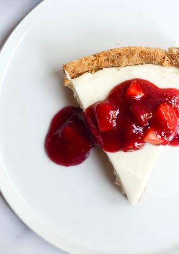 When the cheesecake has chilled, remove the sides of the springform pan and arrange strawberry halves on top of the cheesecake. Drizzle the lemon-infused strawberry preserves over the strawberries and cheesecake before serving.