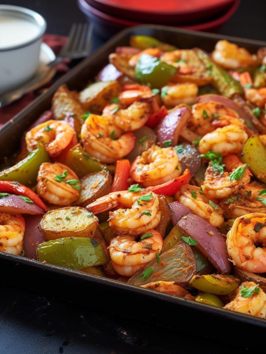 This delightfully zesty one-pan dinner features succulent shrimp, spice-kissed potatoes and bell peppers, roasted to perfection with a spritz of olive oil and a scattering of spices. Crisp, delicious, and easy—it's a weeknight wonder!
