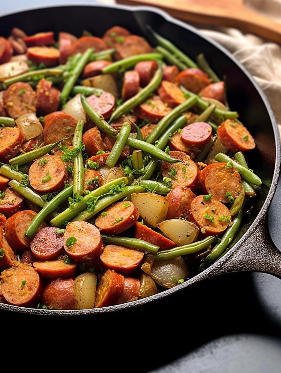 Savor a mouthwatering combination of smoked sausage, baby potatoes, and green beans seasoned to perfection and cooked in a single skillet, making it an ideal and effortless weeknight dinner in under 30 minutes.