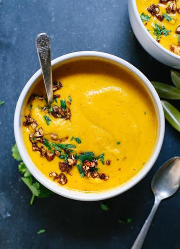 Velvety Thai Carrot & Sweet Potato Soup with Spicy Crunch Topping