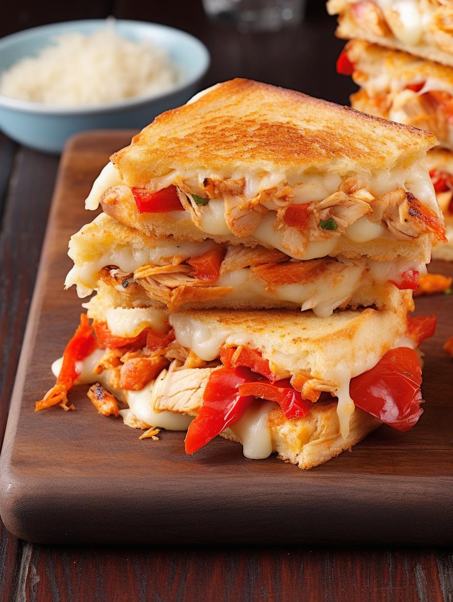 Bite into a chunk of this fiery sandwich packed with spicy shredded chicken, roasted bell peppers, and a delightful blend of creamy, melted pepper jack cheese sandwiched between two slices of crispy, garlic-infused bread.