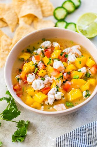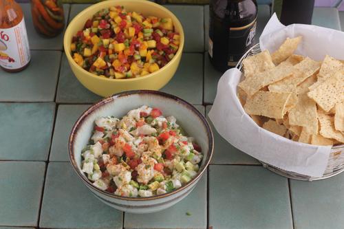 Ceviche is a dish made by marinating fish and/or seafood in an acidic liquid which "denatures" the protein and "cooks" it without any heat. You can make ceviche with any firm white fleshed fish or seafood...swordfish works very well. In this version, I've veered away from the typical Latin American...