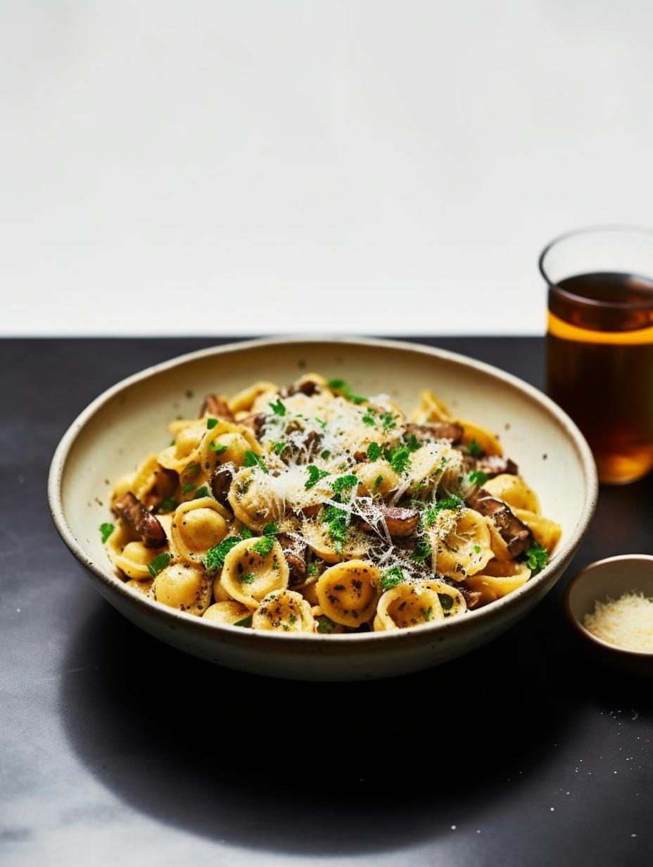 Savor the deliciousness of a Vegetarian Mushroom Carbonara Delight, blending tender mushrooms and a creamy Parmesan sauce, perfectly complementing the orecchiette pasta for an irresistible meal.