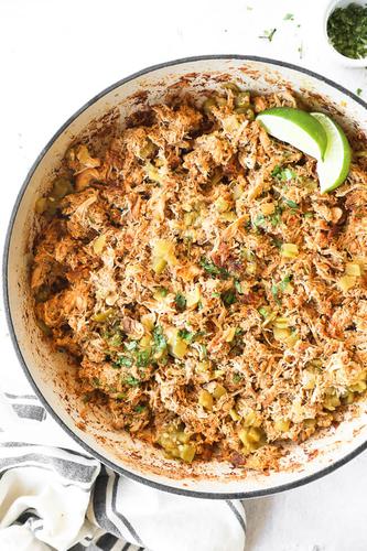 Return the shredded chicken to the skillet, add chicken broth, minced chipotle pepper, and lime juice. Mix everything well.