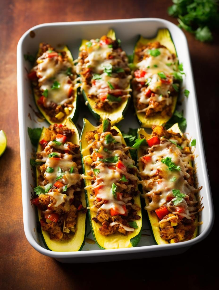 Bite into these scrumptious taco boats loaded with zucchini, flavorful rice, black beans, and vegetables topped with melty cheese for a delightful meatless meal that everyone will enjoy.