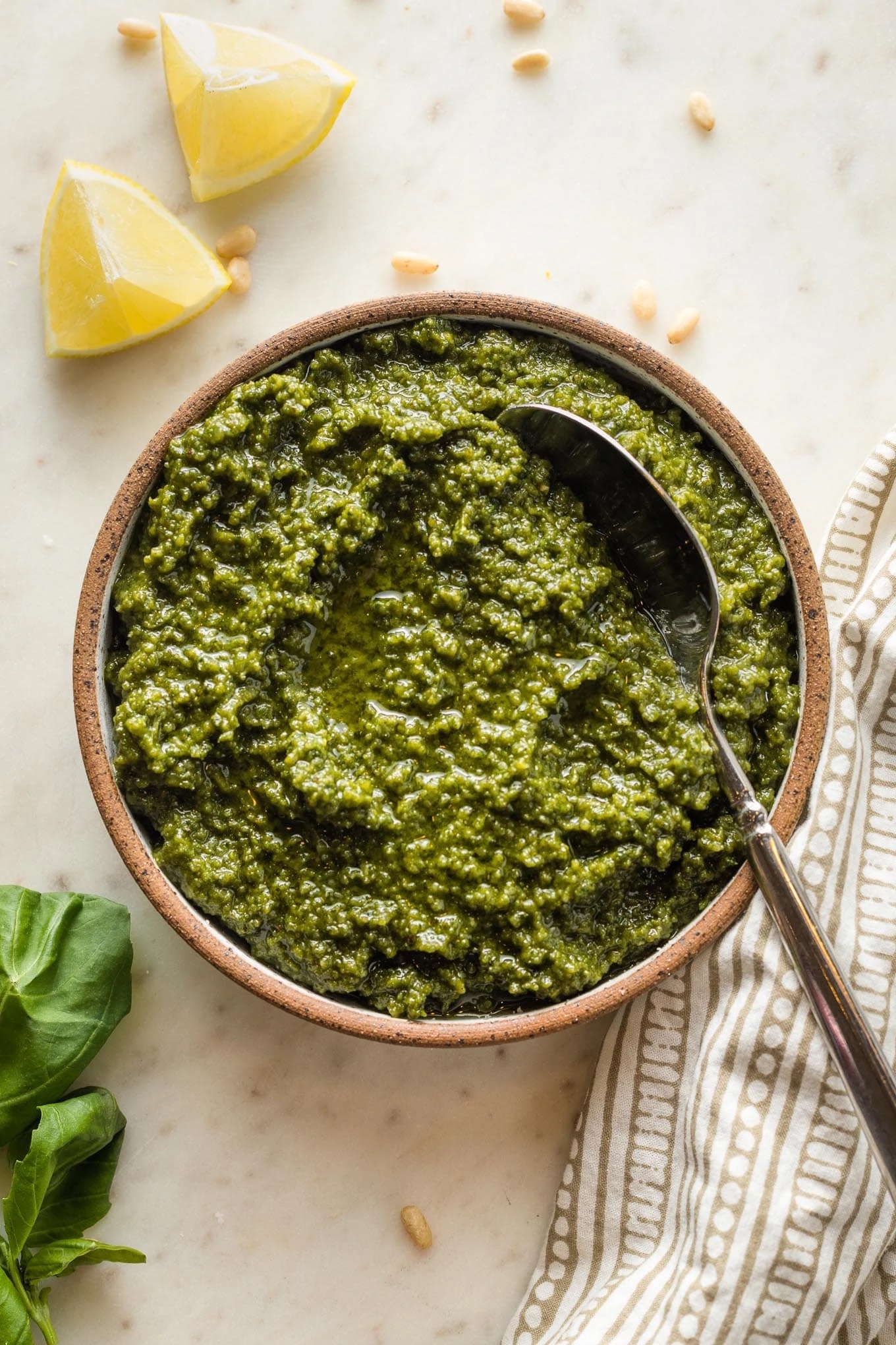 This easy basil pesto recipe comes together in less than 5 minutes. It's cheesy, flavorful, and nut-free. Enjoy this delicious spread with salads, sandwiches, pasta, and many Italian dishes.