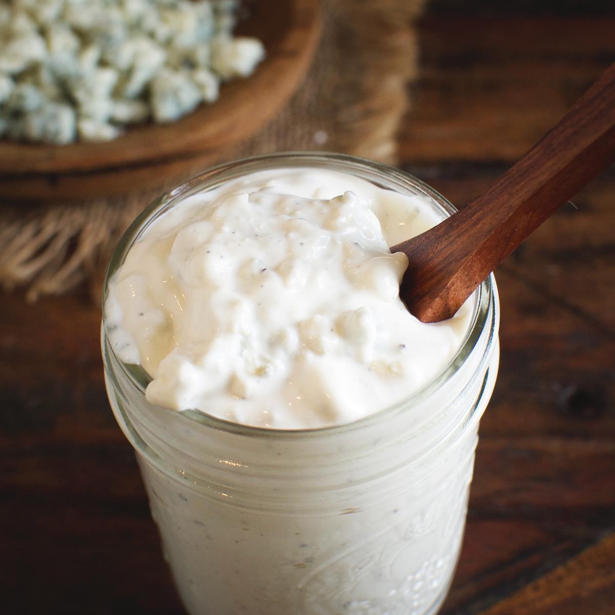 In a medium mixing bowl, combine Greek yogurt, sour cream, 1/4 cup of blue cheese, onion powder, garlic powder, red pepper flakes, sea salt, and cracked black pepper. Mix well, breaking up blue cheese crumbles. A few lumps is fine as it adds to the texture.